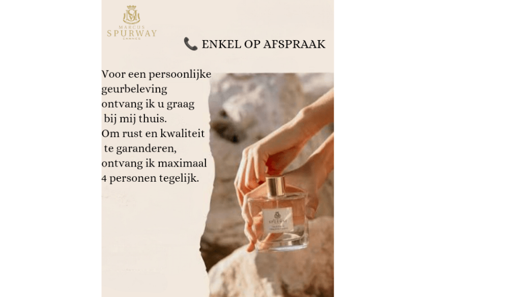 Enkel op afspraak: Voor een persoonlijke geurbeleving ontvang ik u graag bij mij thuis. Om rust en kwaliteit te garanderen, ontvang ik maximaal 4 personen tegelijk.